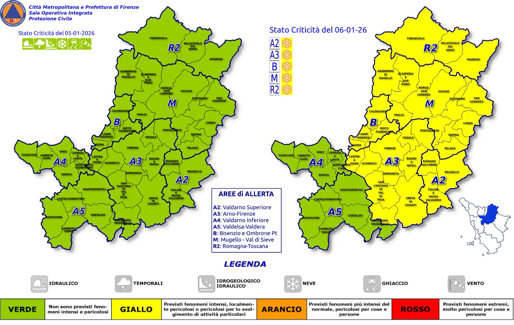Emessa dalla sala della Protezione civile regionale, allerta codice GIALLO, per rischio neve per domani 6 gennaio nelle zone Arno-Valdarno Superiore, Arno-Firenze, Bisenzio e Ombrone Pistoiese, Mugello-Val di Sieve e Romagna-Toscana.
