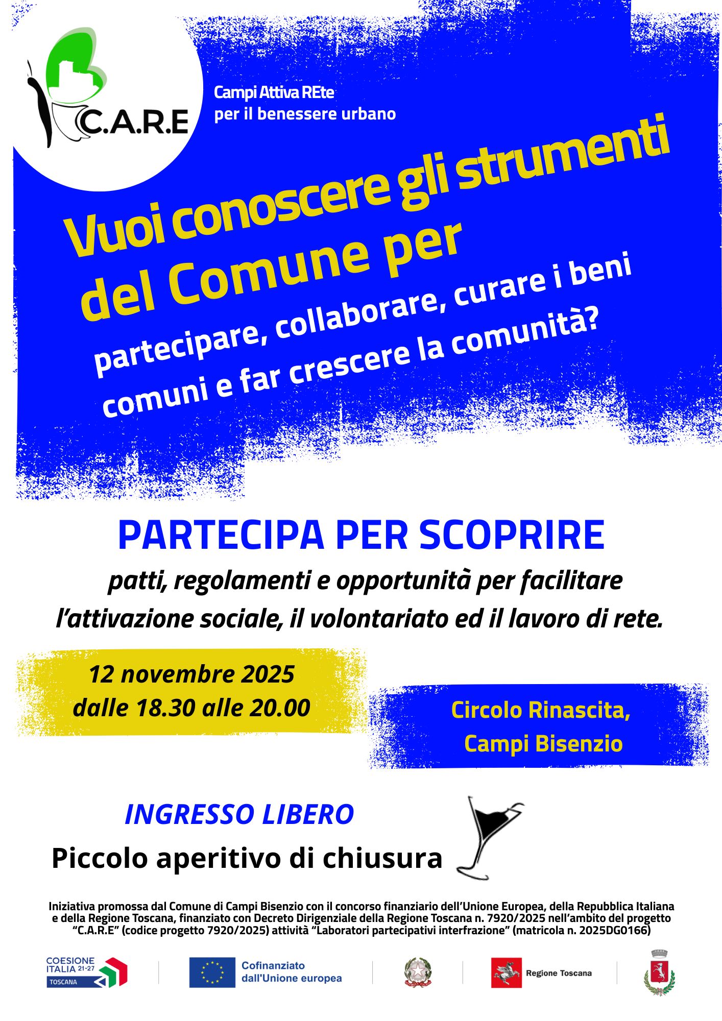 Incontro organizzato nell’ambito del progettoC.A.R.E. – Campi Attiva REte per il benessere urbano. Iniziativa promossa dal Comune di Campi Bisenzio con il concorso finanziario dell’Unione Europea, della Repubblica Italiana e della Regione Toscana, finanziata con Decreto Dirigenziale della Regione Toscana n. 7920/2025, nell’ambito del progetto C.A.R.E. (codice progetto 7920/2025) – attività “Laboratori partecipativi interfrazione” (matricola n. 2025DG0166).