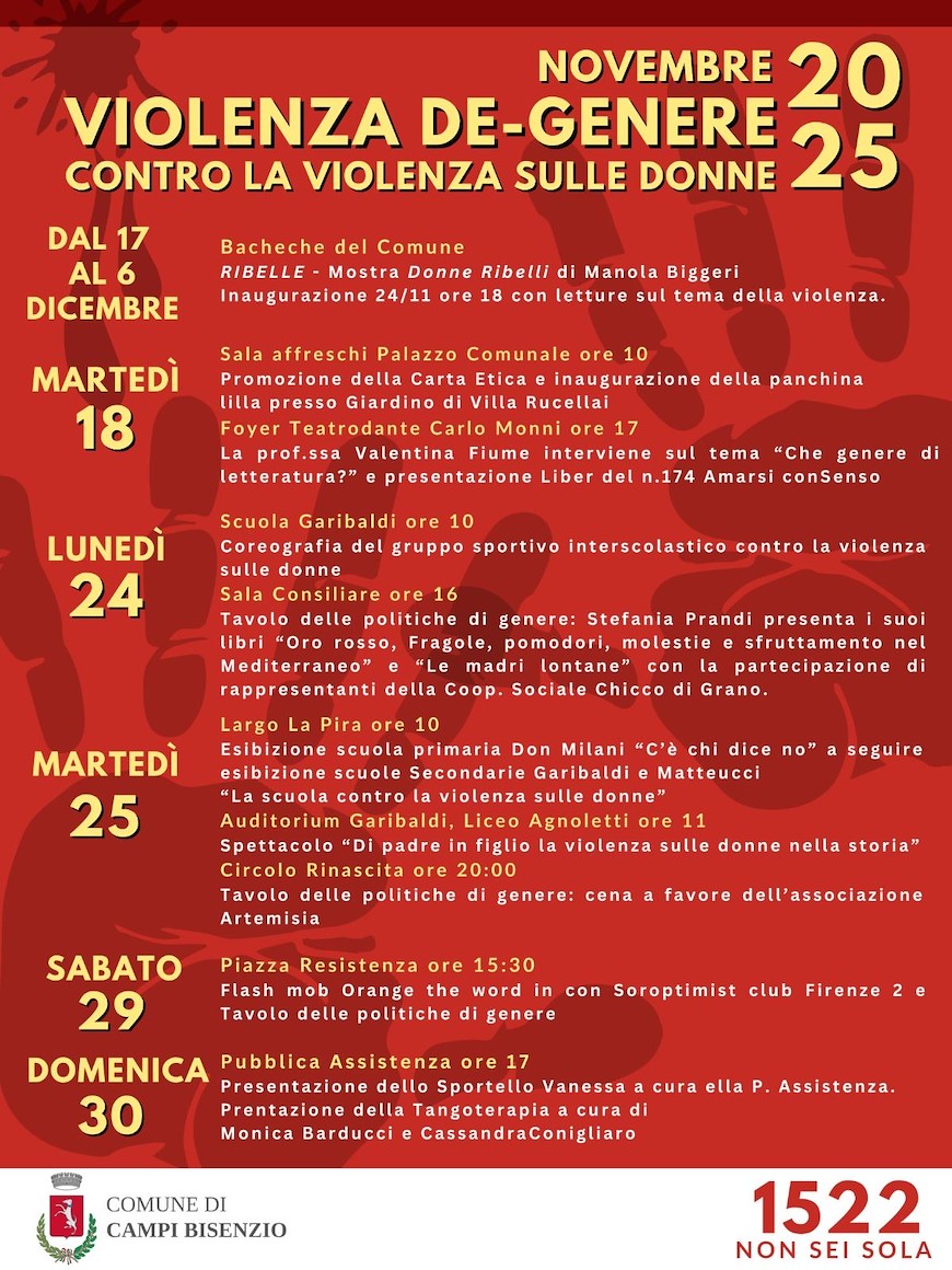 Per tutto il mese di novembre, l’Amministrazione comunale di Campi Bisenzio, in collaborazione con il Tavolo delle politiche di genere e la Fondazione Accademia dei Perseveranti, propone una serie di eventi dedicati alla sensibilizzazione e al contrasto della violenza di genere.
